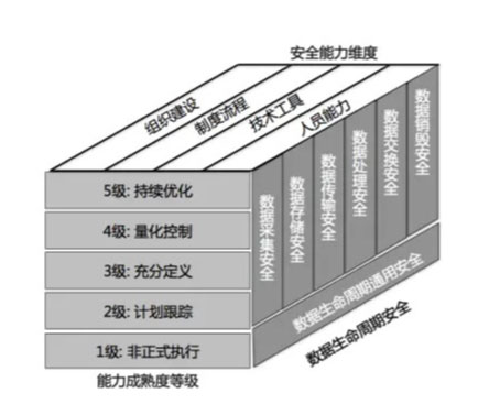 DSMM国家标准以组织的数据为中心,围绕数据的采集、传输、存储、处理、交换、销毁全生命周期,从组织建设、制度流程、技术工具、人员能力4个能力维度,按照1-5级成熟度,评价组织的数据安全能力。