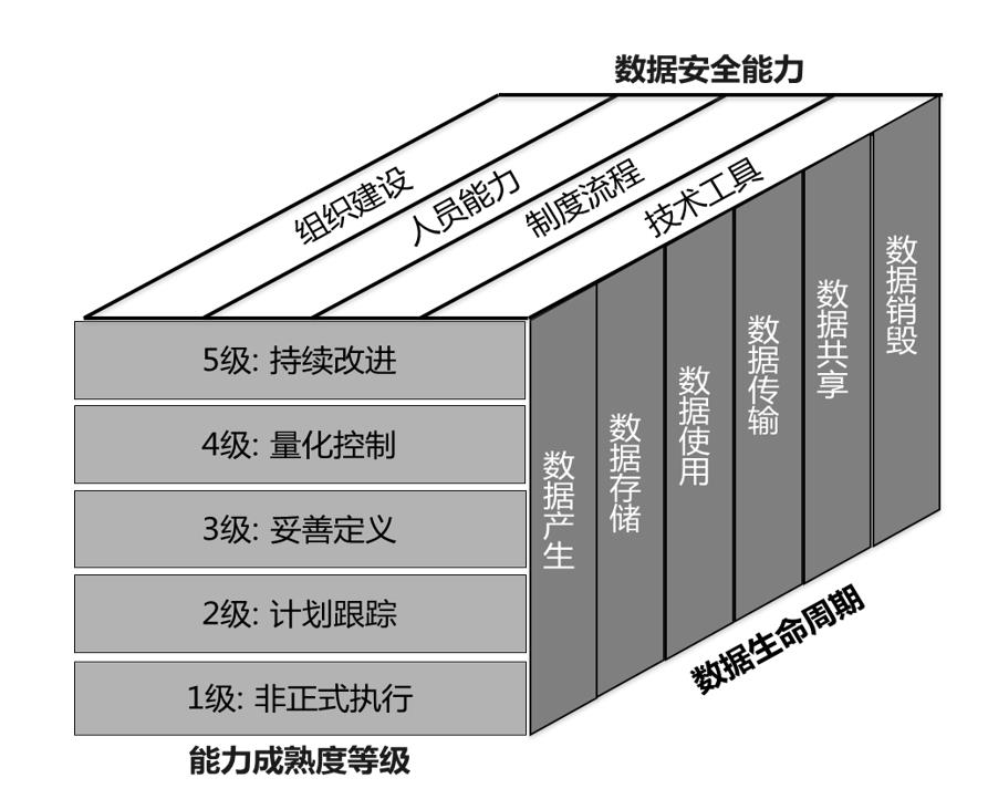 DSMM国家标准以组织的数据为中心,围绕数据的采集、传输、存储、处理、交换、销毁全生命周期,从组织建设、制度流程、技术工具、人员能力4个能力维度,按照1-5级成熟度,评价组织的数据安全能力。